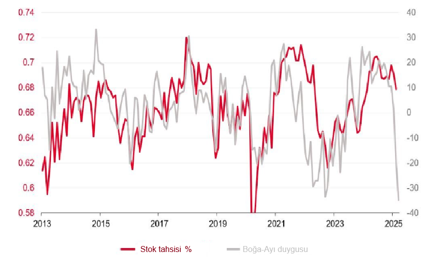 Çizgide önemli dalgalanmalar görülüyor, özellikle grafiğin sonuna doğru (2024-2025) güçlü düşüşler görülüyor. Boğa-ayı hissiyatı arttığında, hisse senedi tahsisi de artma eğilimindedir.