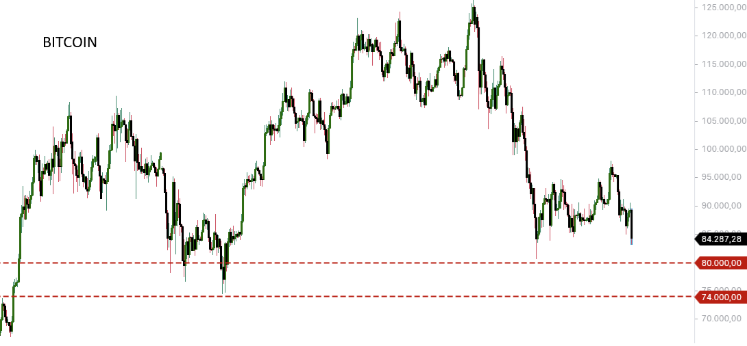 Önümüzdeki saatler gelecekteki trendi belirleyecek. Kilit seviye 84.100 dolarda bulunuyor. Bu, ABD spot ETF’lerinin alıcılarının ortalama giriş fiyatıdır. Bitcoin şu anda bu psikolojik olarak önemli eşiğin biraz üzerinde işlem görüyor. Bu seviye kesin olarak kırılırsa, 80.000 dolar seviyesi gündeme gelecektir.