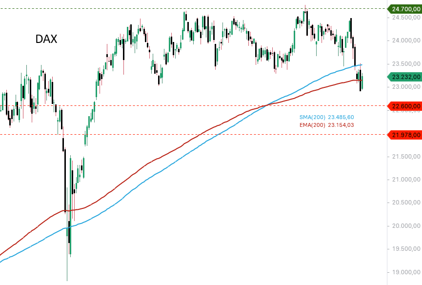 DAX teknik açıdan bir güvenlik ağı görevi gören 22.600 puan civarında bir desteğe sahip. Orta vadeli yükseliş trendi çizgisi, aynı zamanda bir güvenlik ağı görevi de görüyor ve 21.950 puan çizgisi boyunca uzanıyor.