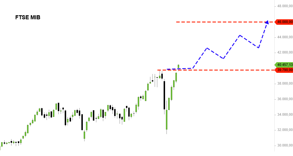 Amerika´nın gümrük konusunda geri adımları sonrasında iyileştirmesini bitireN FTSE MIB yeni zirvelere yelken açmış durumda olup 46000 puanı hedeflemektedir.