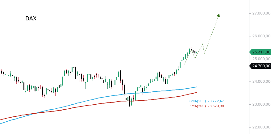 Trump’ın gümrük vergisi tehdidi Pazartesi günü DAX endeksini aşağı çekebilir. Ancak başkanın bu baskıyı ne kadar süreyle sürdüreceği tartışmalı. Çatışmalarda birkaç kez geri adım atmıştı. Sonuç olarak, endeksler rekor seviyelerde seyrediyor.