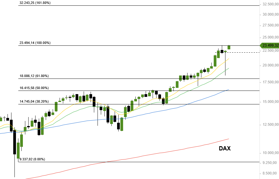 23.500 puan seviyesinde DAX’ın geçici olarak yatay hareket etme ihtimali artıyor. Eğer endeks haftalık kapanış fiyatı bazında 23.500 puanın üzerine ikna edici bir şekilde dinamik bir şekilde yükselirse, bu durum pro-döngüsel olarak 25.000, 26.000 ve 28.000 ve daha sonra muhtemelen 32.000 puanda projeksiyon hedefleri olan yeni bir orta vadeli (yani birkaç haftadan birkaç aya kadar satın alma sinyalini harekete geçirecektir.
