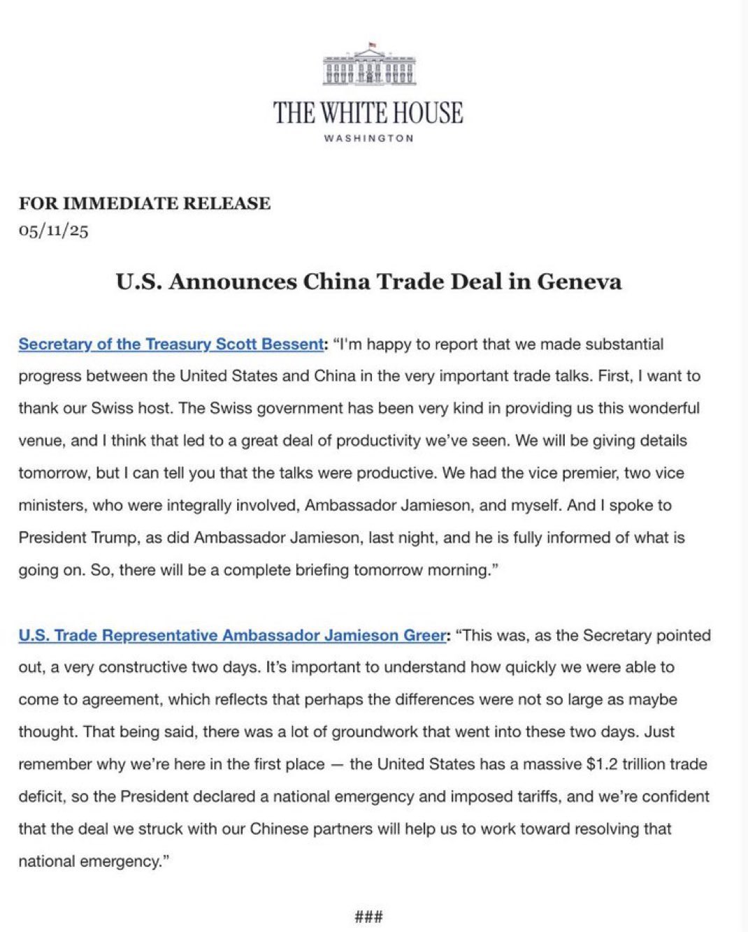 ABD hisse senetleri için alım tavsiyesinde bulundu. O günden bu yana büyük iş adamı Trump fırsatlar sunmaya çalışıyor. İngiltere’de ile anlasti. ABD ve Çin dün itibarıyla İsviçre’de müzakerelere başladı. ABD, Çin ile ticaret anlaşması duyurdu Beyaz Saray’ın bugünkü resmi basın açıklaması. ABD Hazine Bakanı Scott Bessent ve ABD Ticaret Temsilcisi Büyükelçi Jamieson Greer, Cenevre’de gerçekleşen ABD-Çin ticaret görüşmelerinde önemli ilerleme sağlandığını bildirdi. Scott Bessent, öncelikle ev sahibi ülke İsviçre’ye mekanı sağladığı için teşekkür etti ve bunun çok üretken bir atmosfere katkıda bulunduğunu vurguladı. Çin Başbakan Yardımcısı ve iki bakan yardımcısı da dahil olmak üzere her iki taraftan üst düzey temsilcilerle yapılan görüşmelerin yapıcı ve başarılı olduğunu vurguladı. Başkan Trump’a tam brifing verildi ve ertesi sabah kapsamlı bir basın toplantısı planlandı. Büyükelçi Jamieson Greer, anlaşmaya şaşırtıcı derecede hızlı ulaşıldığını, bunun da ABD ile Çin arasındaki farklılıkların beklenenden daha az olduğunu gösterdiğini vurguluyor. ABD’nin 1,2 trilyon dolarlık devasa bir dış ticaret açığı olduğunu ve bu nedenle başkanın ulusal acil durum ilan edip gümrük vergileri uyguladığını hatırlatıyor. Çin ile varılan anlaşmanın bu acil durumun çözümüne yardımcı olması amaçlanıyor.
