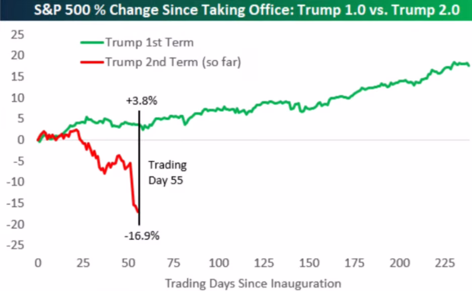 Donald Trump’ın göreve gelmesinden bu yana ABD endeksleri önemli ölçüde değer kaybetti. S&P500 şu anda tüm zamanların en yüksek seviyesinin yaklaşık %30 altında ve ilk görev gününden beri 55 günde % 16,9 geriledi aynı günde ilk dönemde % 3,8 yükselmişti.